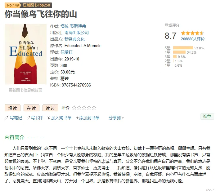 《你当像鸟飞往你的山》PDF电子资料分享点击上方蓝字 关注我,获取更多电子书分享 | 本期书单电子版下载方式见文末 ~作者: 塔拉·韦斯特弗出版社: 南海出版公司出品方:新经典文化原作名: Educated: A Memoir译者: 任爱红出版年: 2019-10ISBN: 9787544276986特别声明:图片和资料来源于网络,版权归原作者所有,若有侵权,请联系告知,删除相关信息