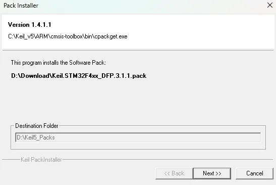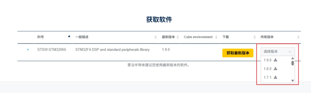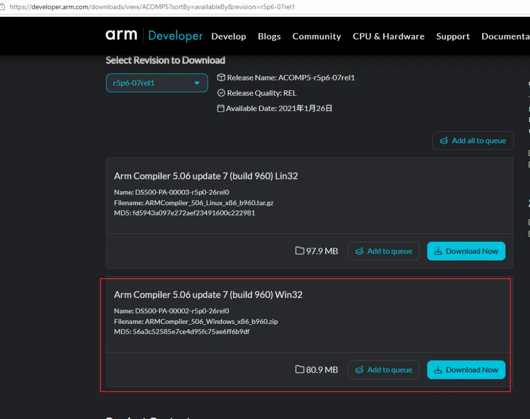 5. 点击MDK,进行下载。由于网络限制,下载比较慢,但是为了用到正品软件,这种等待还是值得的1. 选择MCU芯片型号,下载DFP(Device Family Pack),双击安装DFP。DFP中包含了芯片的启动文件(startup_xxx.s),系统配置文件(system_xxx.c),外设驱动,系统Flash编程算法(FLM文件),调试用的SVD文件(System View Description)(1)网址:https://www.keil.arm.com/devices/(3)双击安装:安装的地址可以在uVersion IDE中的Pack Installer进行设置(Pack Installer->File->Settings)2. 选择MCU芯片型号,下载芯片的外设驱动库。芯片外设驱动库中包含外设驱动,已经外设驱动的使用示例。示例对于学习外设驱动非常有帮助。(1)网址:https://www.st.com.cn/zh/embedded-software/stm32-standard-peripheral-libraries.html(4)选择下载方式:登陆账号或访客下载。建议注册账号,并记录账号密码(避免忘记)。下载完成后, 进行解压,内部资源如图所示。3. 下载ARMC5:下载Arm V5 Compiler。下载的最新的Keil MDK并没有该编译器,需要从官网下载。下载该编译器的目的是:如果下载的外设固件包并不是最新的,使用最新的编译器编译老的Cortex-M内核定义文件,可能会出现编译报错(内核定义文件中定义的寄存器在新编译器中不存在)(1)网站:https://developer.arm.com/downloads/view/ACOMP5