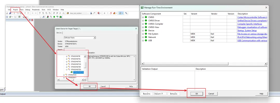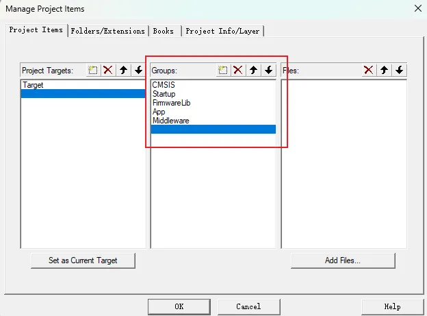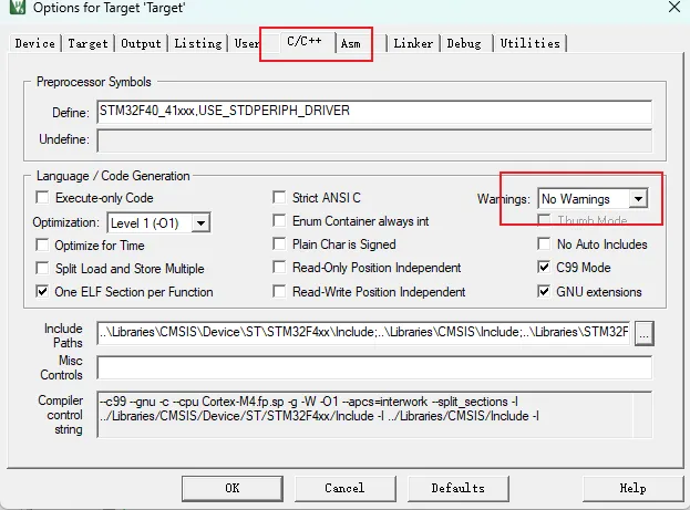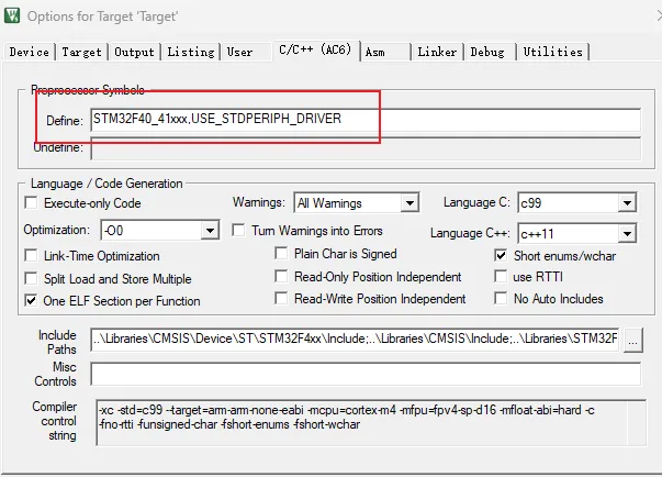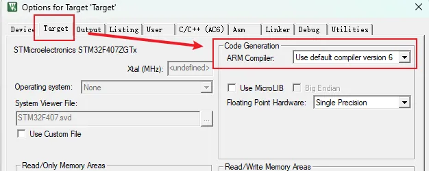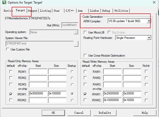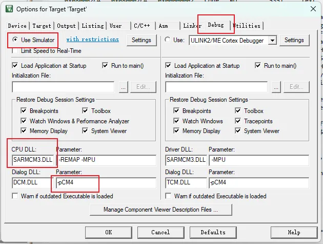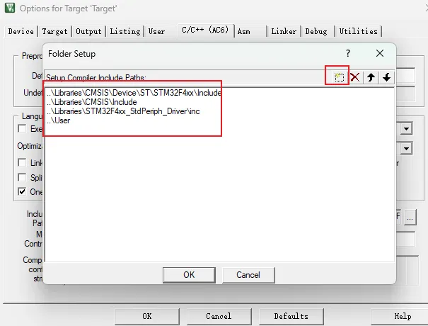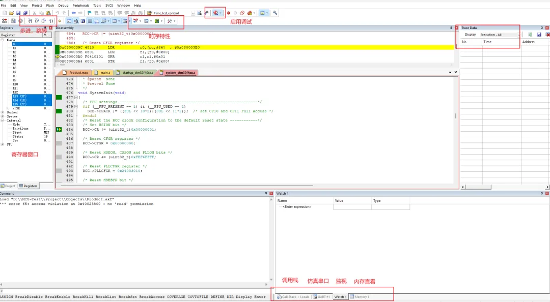 1. 设计项目结构,添加必要文件。设计项目目录结构主要用于管理整个项目的资源。简单的项目主要由以下几个部分组成:Doc存放项目介绍,Libraries存放依赖库,Project存放工程文件,User存放用户代码。(如果需要设计自动化编译脚本,还可以增加Build目录,存放编译脚本;增加Output目录,存放生成文件)。(1)把前置资源下载好的“外设驱动库”中的"CMSIS"和“STM32F4xx_StdPeriph_Driver”目录复制到Libraries中(2)添加必要文件。把前置资源下载好的“外设驱动库”中Project/STM32F4xx_StdPeriph_Templates中的stm32f4xx_conf.h(声明了外设驱动库头文件,定义了assert_param宏,该宏在众多标准外设库中都有使用),stm32f4xx_it.c(用于定义中断函数),stm32f4xx_it.h复制到User目录中。2. 打开uVersion IDE,顶部菜单栏选择Project->New uVersion Project->设置项目名称(选择上述创建号的Project目录)->Select Device for Target(选择MCU型号)->点击OK->点击OK4. 明确目录结构设计。MCU程序由以下几个部分组成:Cortex-M内核文件,芯片启动文件,系统配置文件,外设驱动库,应用程序文件,中间件。按照这个逻辑设计目录结构。如下图所示,CMSIS用于存放内核文件,Startup用于存放启动文件和系统配置文件,FirmwareLib用于存放外设驱动库,App用于存放应用程序文件,Middleware用于存放中间件文件(1)Startup:添加startup_stm32f40xx.s,添加system_stm32f4xx.c。选中目录,右键添加已存在文件(2)添加外设库文件。这里把所有外设都添加上,主要用于后续学习。选中Libraries/STM32F4xx_StdPeriph_Driver/src下的所有文件(3)添加应用程序文件:main.c,stm32f4xx_it.c。在User目录下创建一个main.c文件,把main.c和stm32f4xx_it.c都添加到App中6. 设置目标选项:Options for Target->Target;Options for Target->C/C++。主要用于选择编译器,定义宏,设置编译时的头文件查找目录(与使用gcc编译时指定-I变量是一样的)。(2)设置头文件查找目录。前面添加了哪些头文件,就需要添加对应的头文件目录。主要包括CMSIS/Include(Cortex-M寄存器定义和操作目录),CMSIS/Device/ST/STM32F4xx/Include(系统配置接口声明),STM32F4xx_StdPeriph_Driver/inc(外设库头文件目录),User/(包含头文件stm32f4xx_conf.h,stm32f4xx_it.h)(1)添加3个很重要的头文件到目录中:stm32f4xx.h(外设寄存器定义头文件,位于Libraries\CMSIS\Device\ST\STM32F4xx\Include\stm32f4xx.h),stm32fxx_conf.h(外设库接口头文件,位于D:\MCU-User\stm32f4xx_conf.h),stm32fxx_it.h(中断函数头文件,位于User\stm32f4xx_it.h)(2)增加宏定义:STM32F40_41xxx,USE_STDPERIPH_DRIVER。STM32F40_41xxx(使用型号STM32F407,在stm32fxx_conf.h中存在该编译器宏),USE_STDPERIPH_DRIVER(使用标准外设库,在stm32f4xx.h中存在该条件编译宏)(1)为了避免大量的warning造成干扰,可以在Options for Target->C/C++配置No Warnings(2)报错1:error: unknown register name 'vfpcc' in asm。这个报错的含义是汇编不支持vfpcc这个寄存器,本质就是编译器不支持,无法识别者编译器。这里编译器我们选择是“Use default compiler version 6”,使用"V5.06 update 7"可以解决该问题。如果找不到"V5.06 update 7",可以参考## 前置资源. 3. 解决(在“品”图标->Folders/Extensions中进行配置)(3)其他报错:其他报错均为文件缺失之类的报错,比较容易解决1. Objects中的可执行文件:xxx.axf。二进制机器码+完整调试信息,可直接调试。相比于.hex和.bin文件,更大。.hex包含地址信息+机器码,烧录无需指定地址;.bin仅包含机器码,烧录需要指定地址,主要用于OTA升级,Bootloader,以及量产。可通过ARM编译器工具链中的fromelf程序,把xxx.axf文件转换成xxx.bin文件:fromelf --bin -o xxx.bin xxx.axf;同样也可以使用fromelf程序进行反汇编,把xxx.axf转换成反汇编程序,用于排查问题:fromelf -c xxx.axf -o xxx.txt2. Listings中的映射文件:xxx.map。描述程序的地址映射信息,描述程序中指令和数据的映射地址。同时也描述了指令和数据的空间分布和占用。3. Objects中的调用栈信息文件:xxx.htm。可以用统计静态调用栈的深度4. 配置问题。如果上述文件不存在,请检查相关配置。Options for Target->Output;Options for Target -> Listing调试主要包含两种方式,一种是仿真调试,一种是硬件调试(需要依赖ARM仿真器)。这里我们主要介绍仿真调试(无需硬件设备),Keil对于Cortex-M3提供了很好的仿真支持,对于Cortex-M4的仿真,在要求不高的情况下,可以复用Cortex-M4的动态库。配置如图所示。2. 调试窗口的功能非常丰富,但是具体的调试方法,读者可以根据图片中提示自己摸索3. 实际生产过程中,很多问题都需要使用硬件在线调试。仿真调试只能作为预言的手段,实际硬件依然存在各种电气因素的干扰,仅凭仿真的结果不能作为最终可行的依据。
