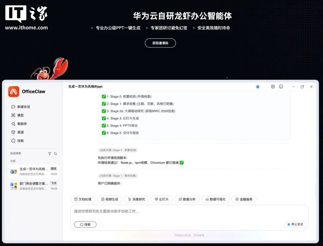 华为云今日举行 OfficeClaw 办公智能体新品体验会,发布了自研龙虾办公智能体 OfficeClaw,华为云官网将于每天 10 点限量发放邀请码。