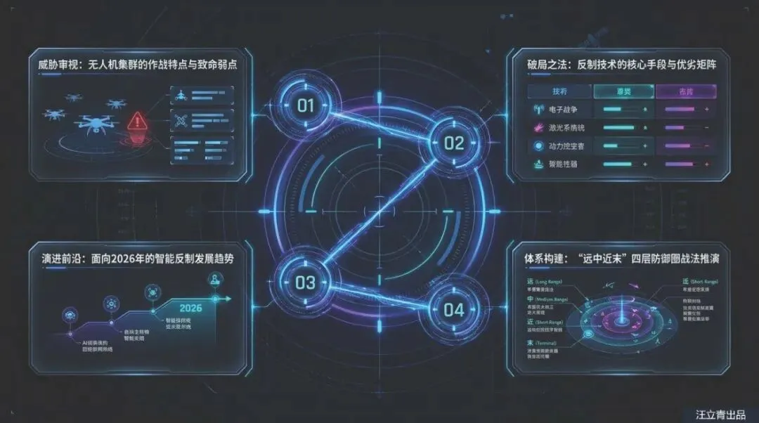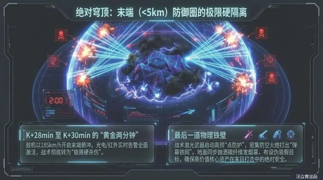 中程圈(10-50km): 持续面杀伤。己方携带拦截网的无人机前出,配合可编程防空弹药在蜂群中心引爆,大幅削减敌方建制规模 。 近程圈(5-10km): 软杀伤压制。开启高功率微波武器,在5公里外构建无形的“电磁隔离面”,强行剥夺敌机链路控制权迫降敌机 。 末端圈(<5km): 黄金两分钟。光电实时告警全面激活,战术激光与防空火炮打出密集的物理弹幕铁网,同步抛洒碳纤维发烟幕,遮蔽核心资产 。