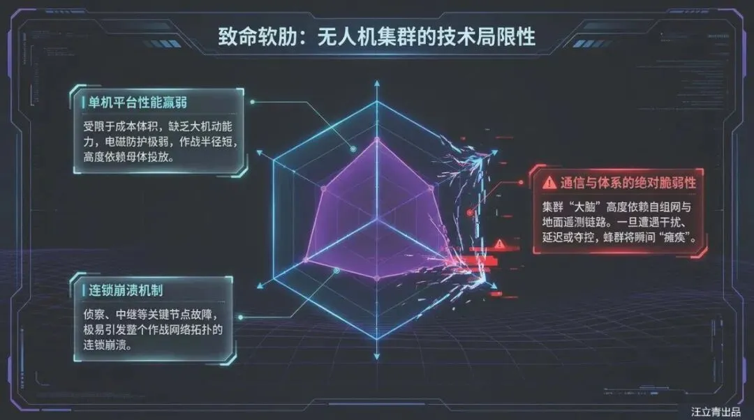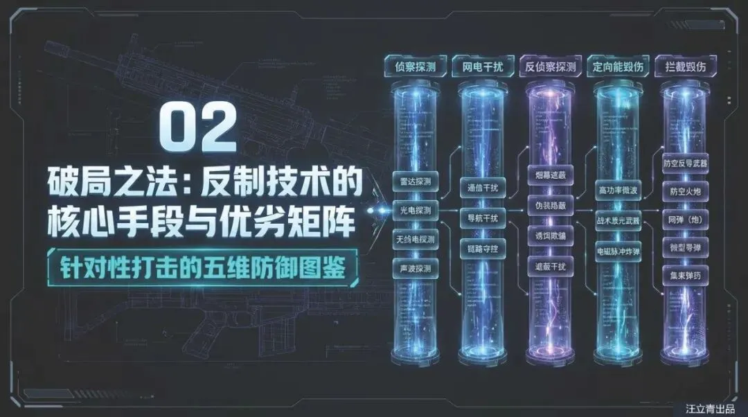 面对打破传统防空效费比的“隐形蜂群”饱和攻击,破局的核心已从物理火力堆砌彻底转向构建“算力穹顶” 。 《关于无人机集群反制技术的深度解读》指出,2024年俄军动用90架自杀式机瘫痪基础设施,以及沙特油田遭遇的“电子战+攻击机+导弹”多向协同打击,标志着无人机已形成从侦察到摧毁的作战闭环 。但集群作战存在致命软肋:其大脑高度依赖自组网与地面测控链路,一旦遭遇干扰或协议劫持,极易引发整个作战网络的连锁崩溃 。 防御体系正围绕多维探测与反制重构五维防御矩阵 。