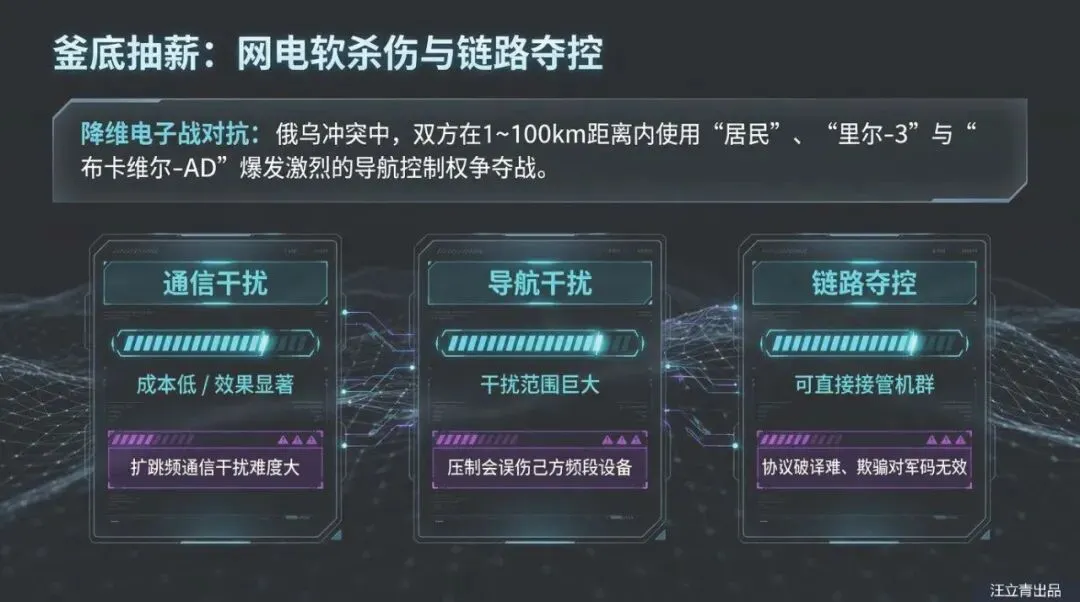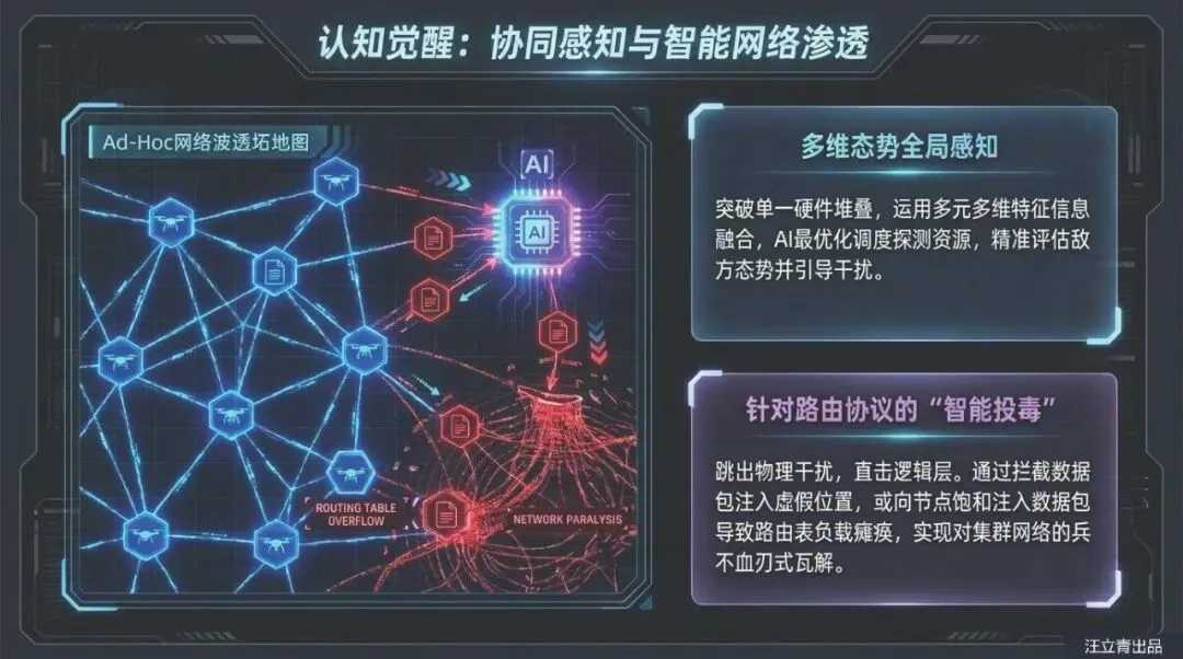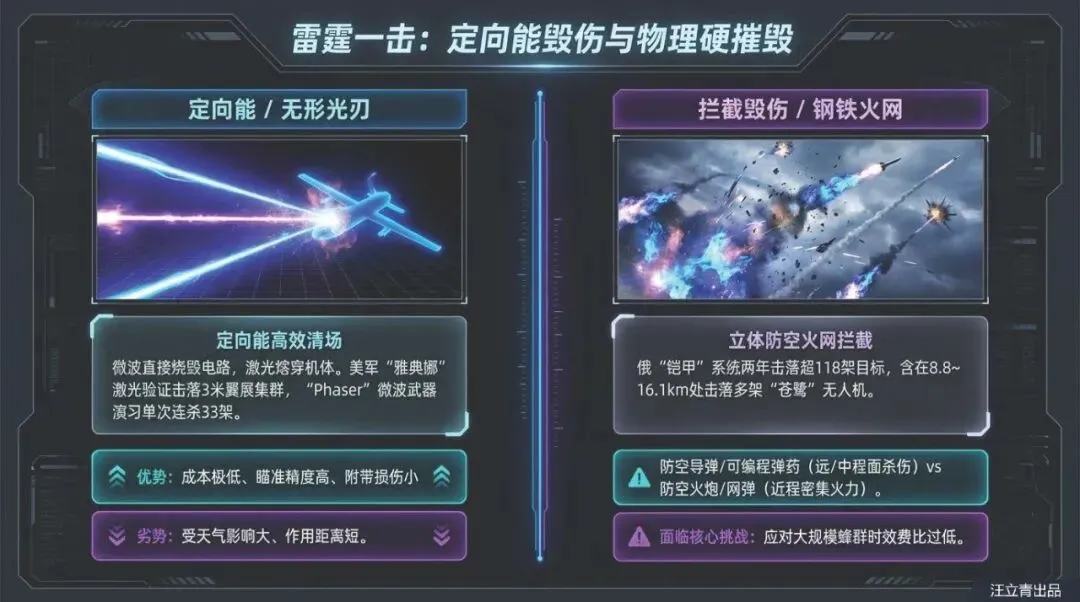 在算力博弈时代,反制手段全面跳出单件硬件堆叠: 网电软杀伤与智能渗透: 突破物理干扰,直击逻辑层。通过截获数据包执行“智能投毒”,向节点饱和注入虚假数据,诱发路由表负载瘫痪,实现对集群兵不血刃的瓦解 。 定向能高效清场: 应对高密度蜂群,微波武器可直接烧毁电路,激光实现机体熔穿。美军“Phaser”微波武器已验证单次连杀33架的能力,以极低成本重塑防空效费比 。