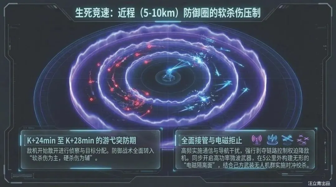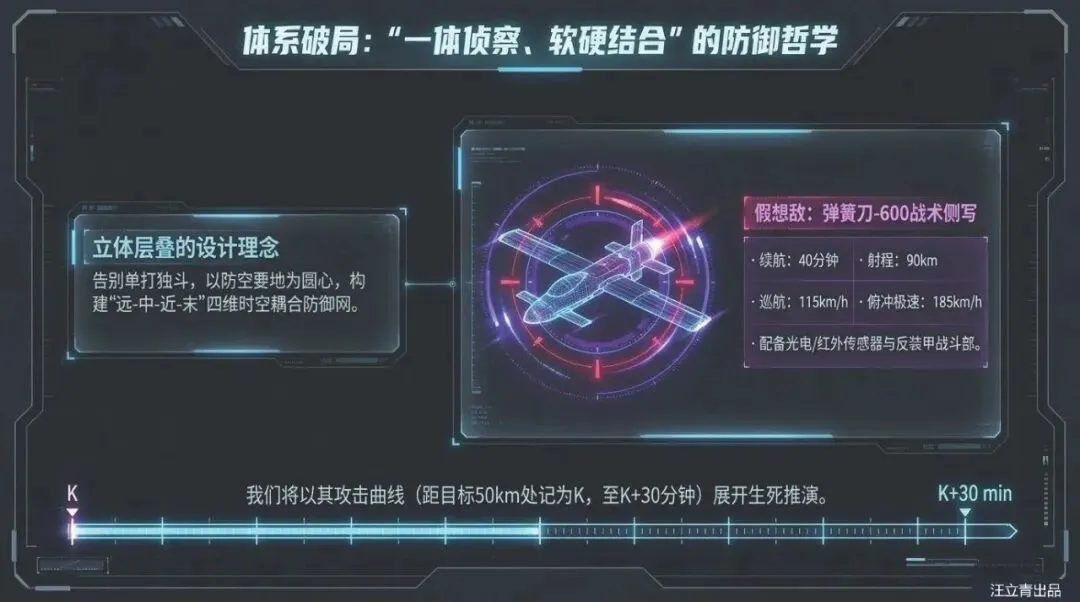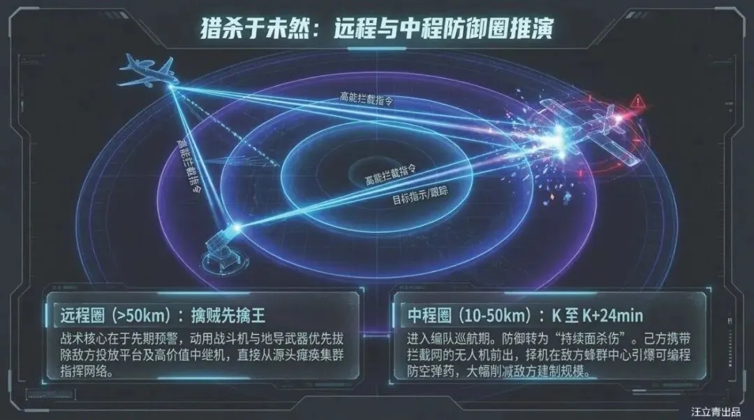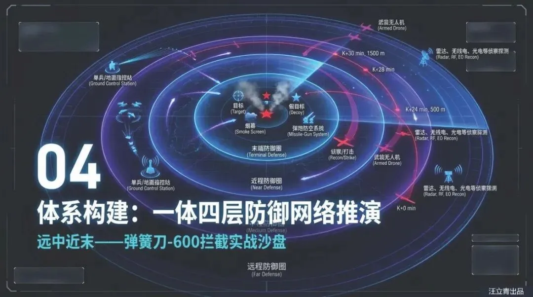 针对诸如“弹簧刀-600”等战术目标,研报实战推演了“一体侦察、软硬结合”的四层时空耦合防御网 : 远程圈(>50km): 擒贼先擒王。动用战斗机与主战兵力先期拔除敌方投放平台与高价值中继机,从源头瘫痪指挥网络 。