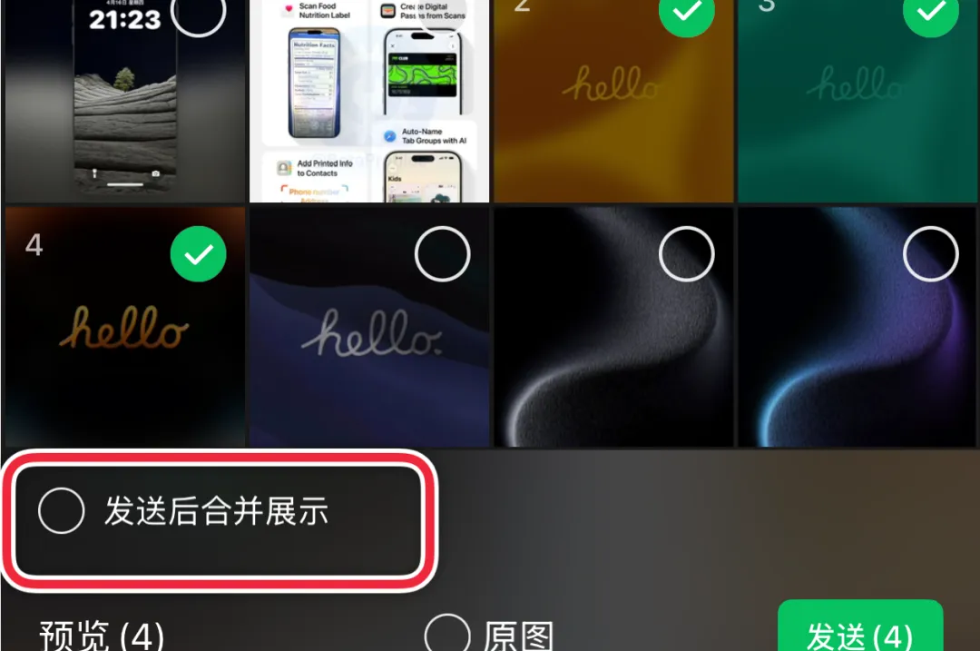 这次内测的点挺直观,选三张起步,图也行,视频也行,混着也行,选好后看左下角,会冒出个合并展示开关,点一下,再发送,就不再一条一条飞出去,而是打个包,收在一起