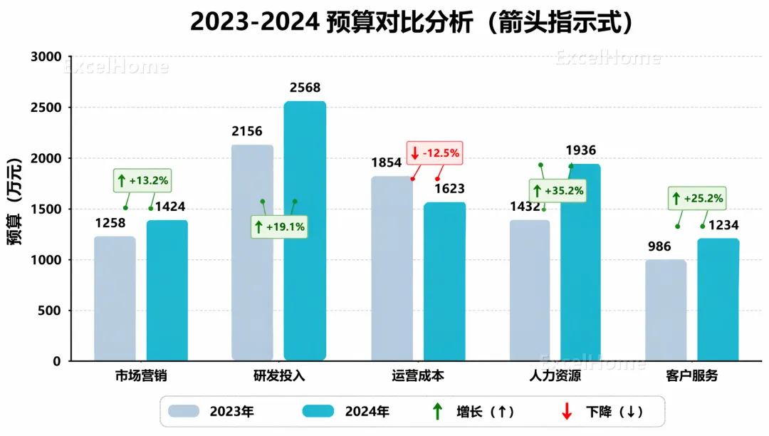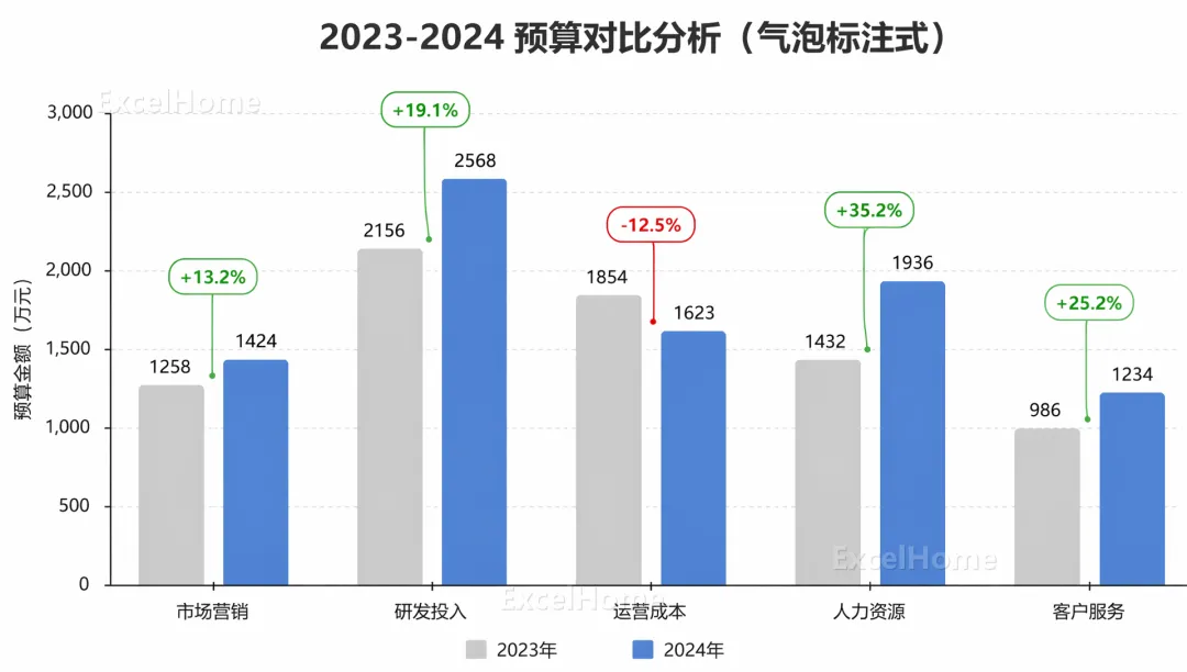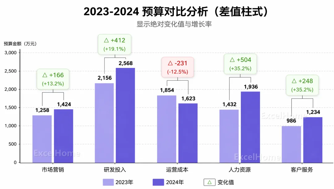 这组三张图都是做预算对比分析的,让人一眼看清哪些项目涨了,哪些项目降了,差了多少,增幅又是多少。