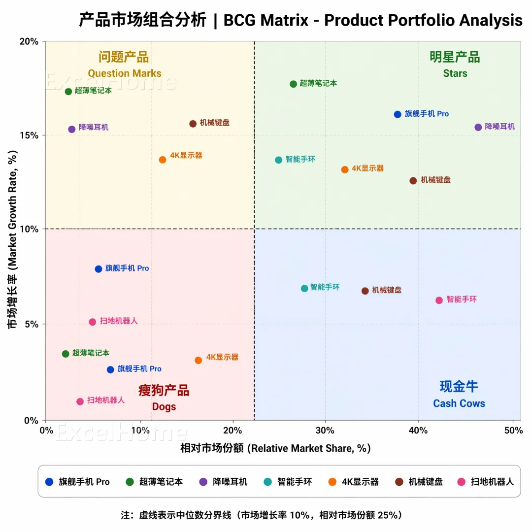 这张图是拿来做产品组合分析的。不同产品分别落在四个象限里,读者一眼就能看出它是明星产品、现金牛还是问题产品。