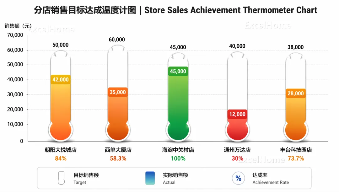 分店销售温度计图:目标、实际、达成率,一张图就讲清楚了