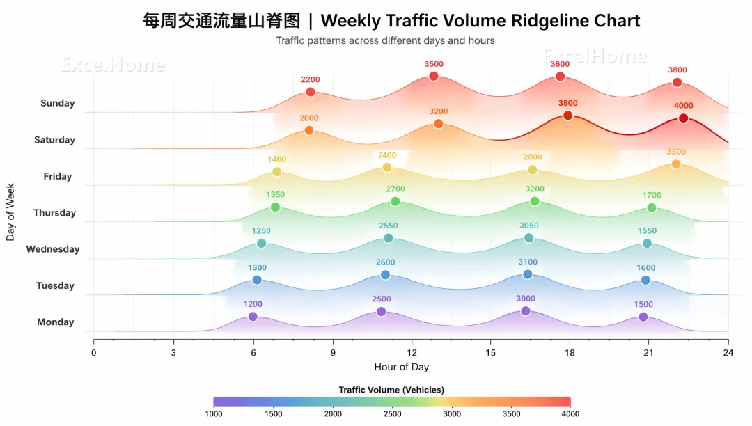 这张图是拿来观察一周每天不同时段交通流量波动的。哪天峰值更高,哪天节奏更长,一眼就能看清。