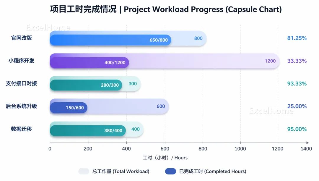 这张图是拿来做项目工时完成情况的。总工时、已完成工时和完成率,都能一张图讲清楚。