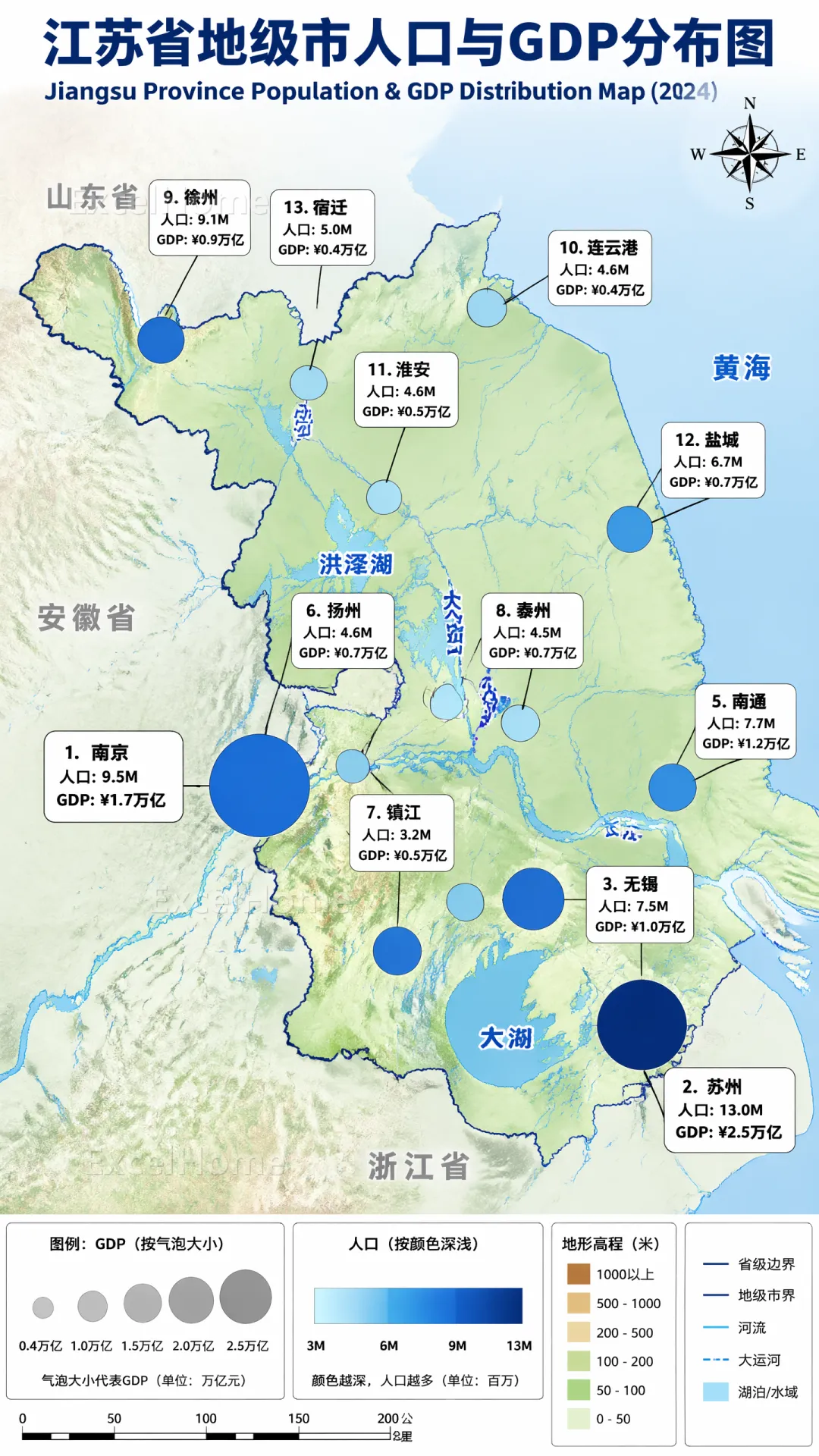 这张图是把江苏各地级市的人口和 GDP 同时放到带地形背景的地图上。气泡大小、颜色深浅和标注框一起配合,区域差异会很清楚。