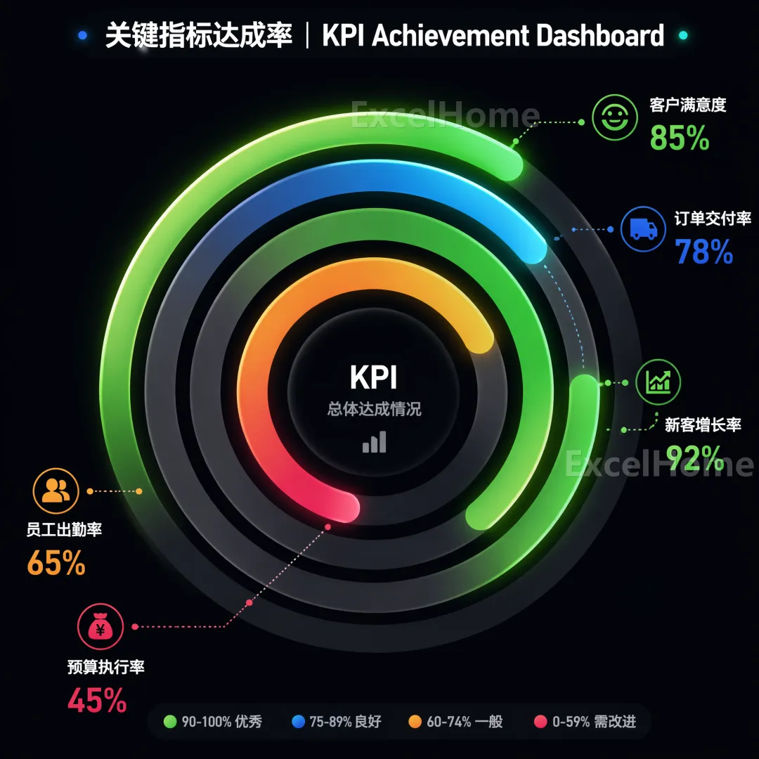 为了做一个精美的绩效子弹图或者极坐标环形图,你可能需要经过:构造辅助列、调整坐标轴重叠、手动添加文本框……最后调色调到怀疑人生。