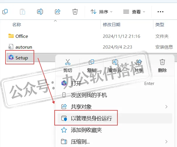 3.选中【Setup】程序,右键选择【以管理员身份运行】打开 Office安装界面。