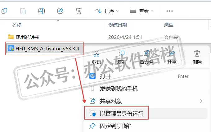 7.选中【HEU_KMS...】程序,右键【以管理员身份运行】。(如果打开后没有这个程序,则是解压没退出杀毒或者系统防火墙、实时保护被拦截删除,可以看看桌面通知栏有没恢复,没有关闭杀毒重新解压即可)