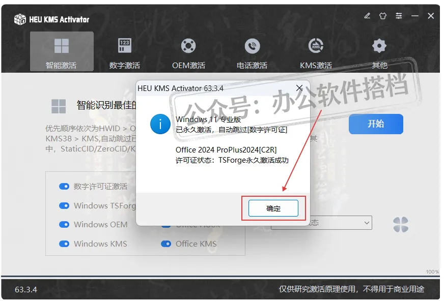 10.可以看到Office 2024激活成功弹窗,点击【确定】然后关闭此程序即可。