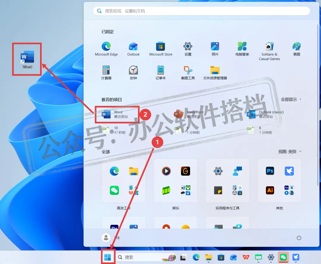 11.创建Office工具的桌面图标:点击开始展开,找到刚刚安装的Office相关工具,例如Word,选中直接拖到桌面就可以创建完成。(需要使用什么工具把相应图标拖到桌面即可)