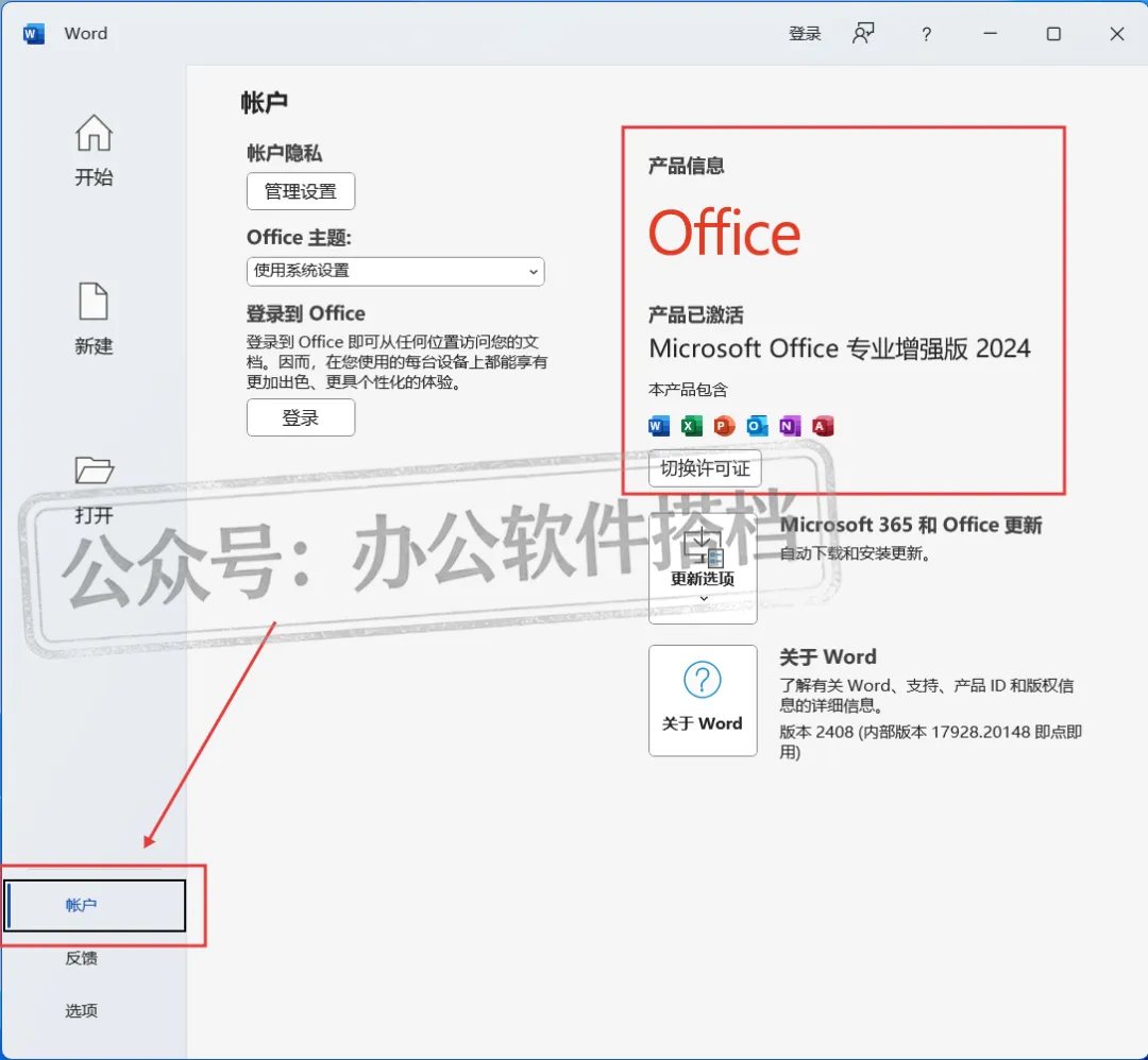 15.点击左下角的【账户】可以查看激活状态,到此Office软件就安装成功了!