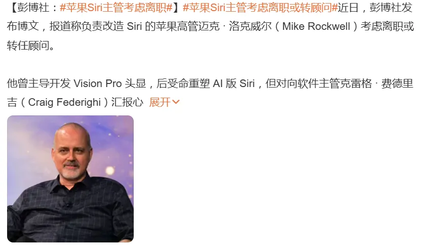 4 月 23 日消息,彭博社发布博文,报道称负责改造 Siri 的苹果高管迈克 · 洛克威尔考虑离职或转任顾问。他曾主导开发 Vision Pro 头显,后受命重塑 AI 版 Siri,但对向软件主管克雷格 · 费德里吉汇报心存顾虑,渴望更大职权。