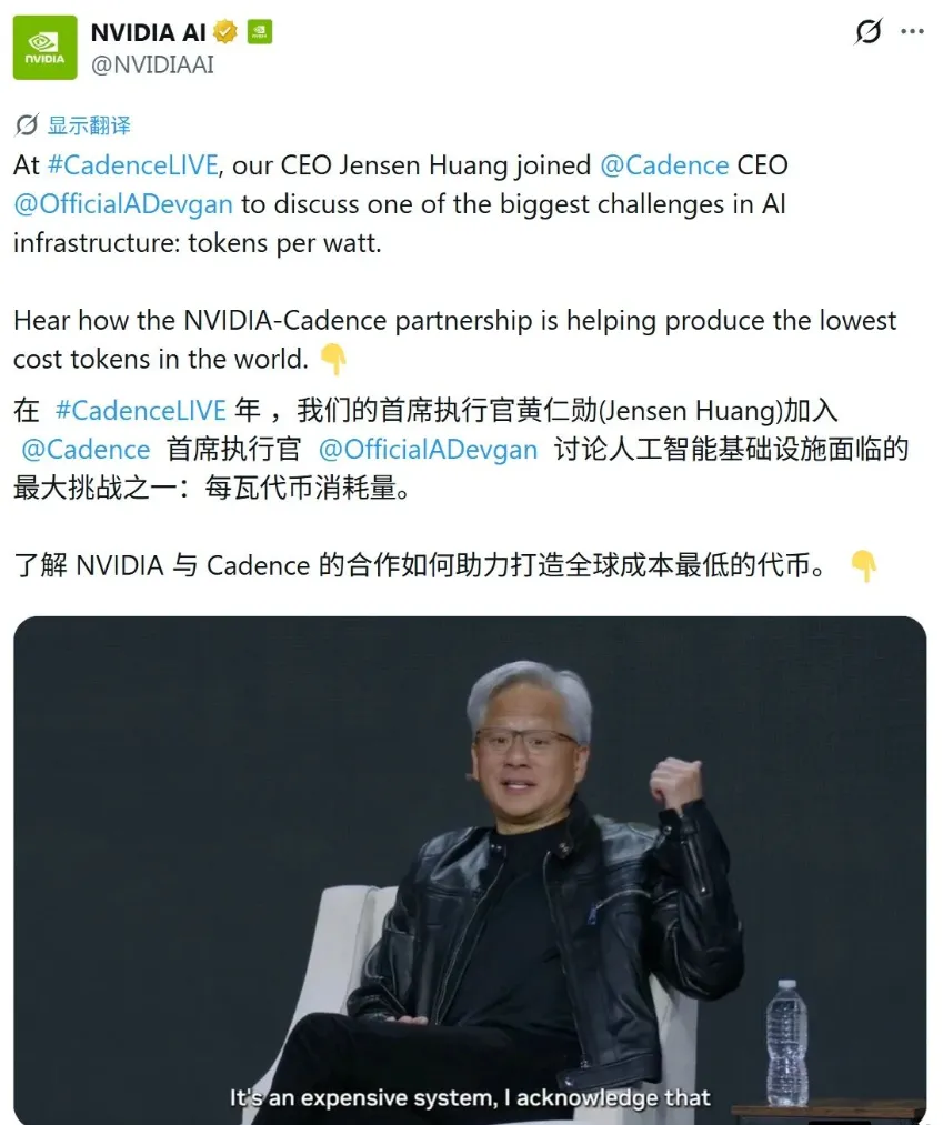 4 月 23 日消息,英伟达官方账号 @NVIDIAAI 在 X 平台发布推文,分享了一段 Cadence Live 2026 活动演讲视频,英伟达首席执行官黄仁勋强调全栈策略是 AI 领导地位的核心,并提出“生产全球成本最低 Token”的观点。