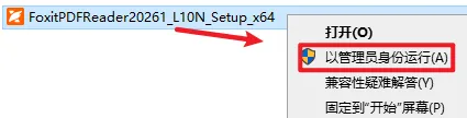 2.打开刚刚解压的文件夹,找到并选中”FoxitPDFReader20261_L10N_Setup_x64”右键选择“以管理员身份运行”