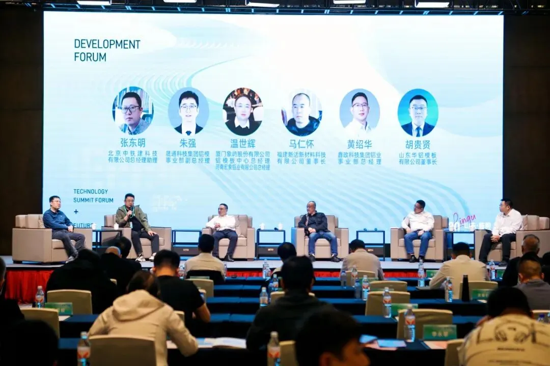 论坛交流环节,由山东华铝模板有限公司董事长胡贵贤主持,北京中铁建科技有限公司总经理助理张东明;厦门象屿股份有限公司铝模板中心总经理、河南宏象铝业有限公司总经理温世辉;福建新活动材料科技有限公司董事长马仁怀;鑫政科技集团铝业事业部总经理黄绍华;晟通科技集团铝模事业部副总经理朱强为论坛嘉宾。他们各抒己见,分别从数字化转型、绿色创新、技术突破、人才培养、产业链协同角度展开热烈讨论,不同的观点和想法在这里碰撞出智慧的火花,现场气氛活跃而融洽。