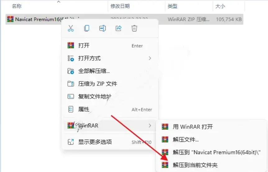 1.鼠标右击下载的【Navicat Premium16(64bit)】压缩包,选择【解压到 Navicat Premium16(64bit)】。