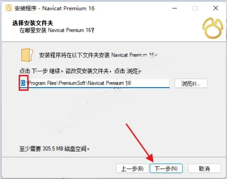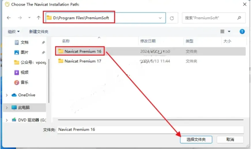 13.选择安装路径根目录下的【navicat premium 16】文件夹(参考步骤5更改的磁盘位置路径)点击【选择】。