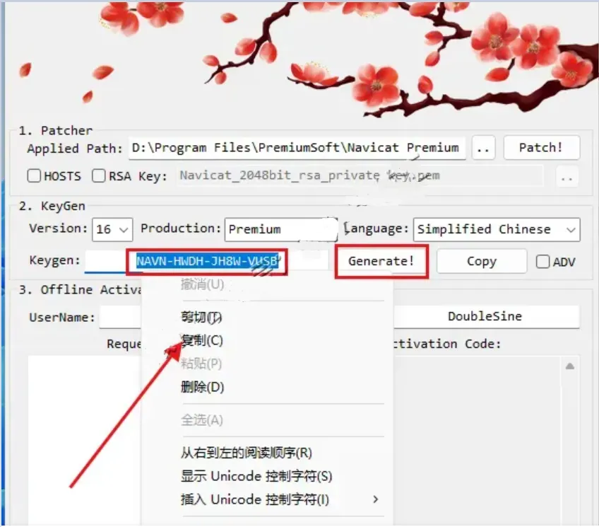 15.点击【Generate】,选中Keygen后的代码,鼠标右击选择【复制】(不要关闭此窗口继续后面的步骤)。
