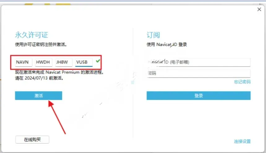 19.将步骤15复制的许可秘钥粘贴到下图所示位置,点击【激活】。