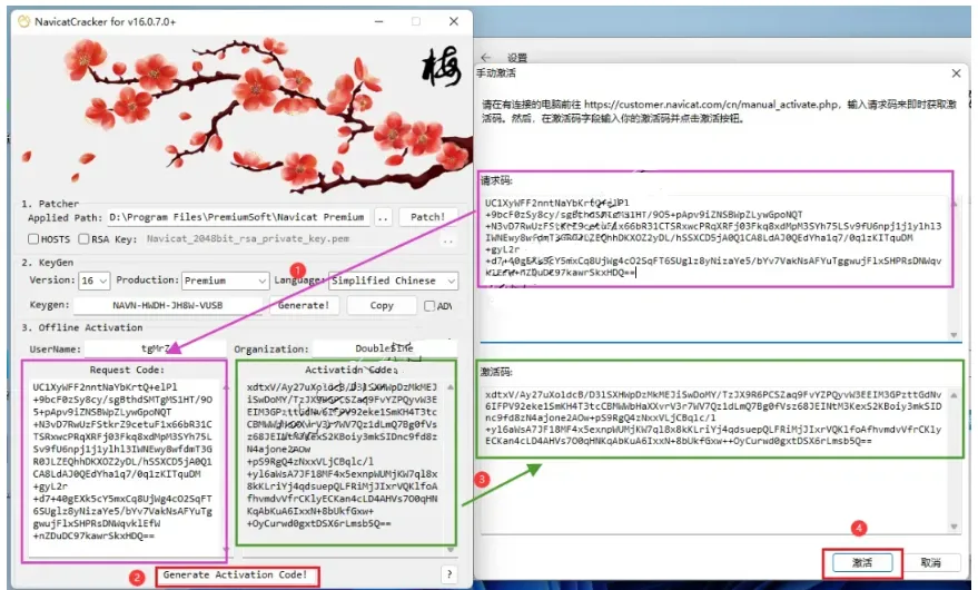 21.①复制请求码粘贴到Request Code框中②点击【Generate Activation】③将生成的【Activation Code】复制,粘贴到激活码框中④点击【激活】(具体操作如下图所示)。