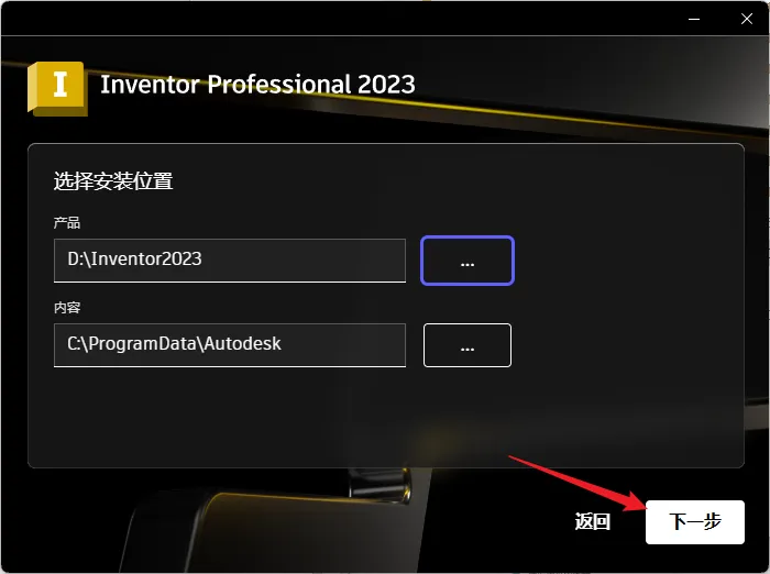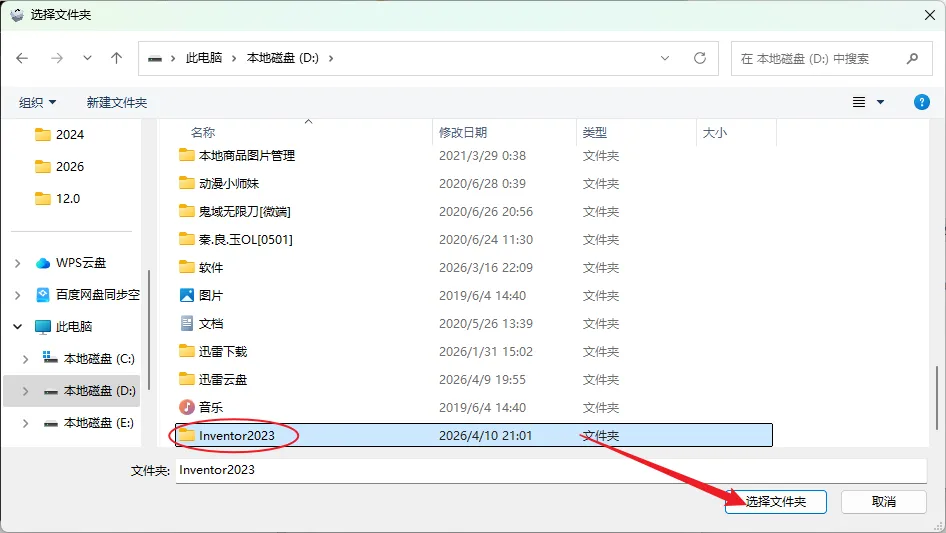 7.选择内容需要安装的路径(如:D盘),新建一个【Inventor2023】并选中,点击【选择文件夹】。