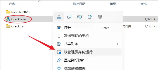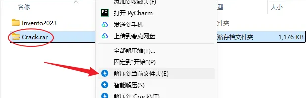 13.打开安装包解压后的【Inventor2023】文件夹,鼠标右击【Crack】选择【解压到当前文件夹】。