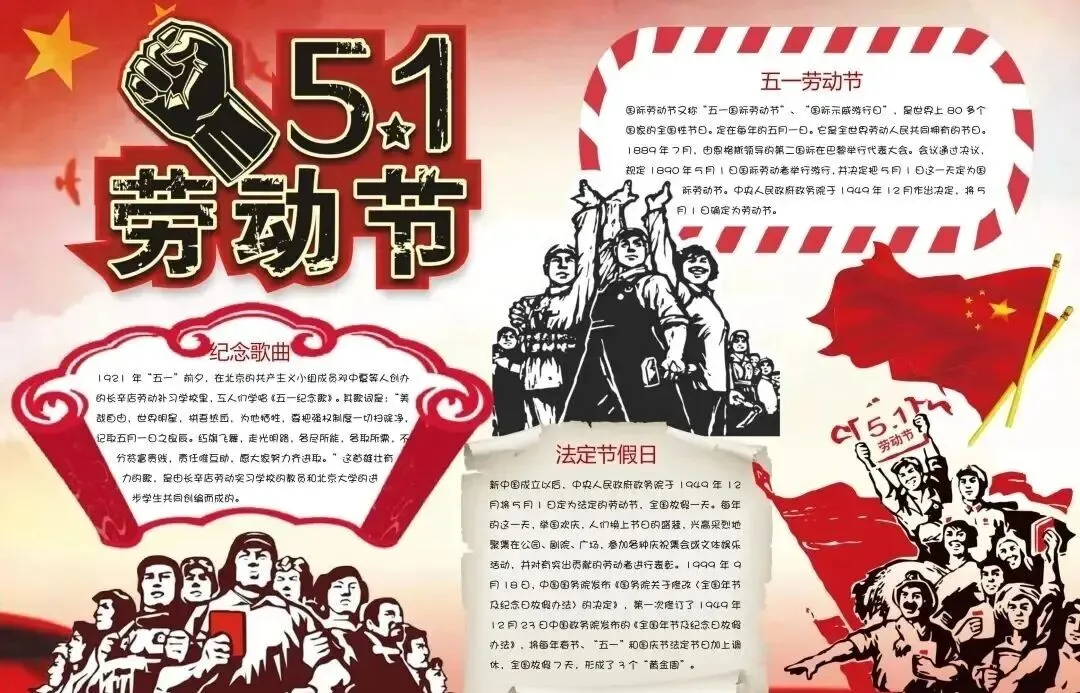 五一劳动节,中国的劳动节,中国人民庆祝劳动节的活动可追溯至1918年。这一年,一些革命的知识分子在上海、苏州、杭州、汉口等地向群众散发介绍“五一”的传单。1920年5月1日,北京、上海、干州、九江、唐山等各工业城市的工人群众浩浩荡荡地走向街市、举行了声势浩大的游行、集会。李大钊专门在《新青年》上发表了《“五一”运动史》,介绍“五一”节的来历和美法等国工人纪念“五一”的活动,号召中国工人把这年的“五一”作为觉醒的日期。