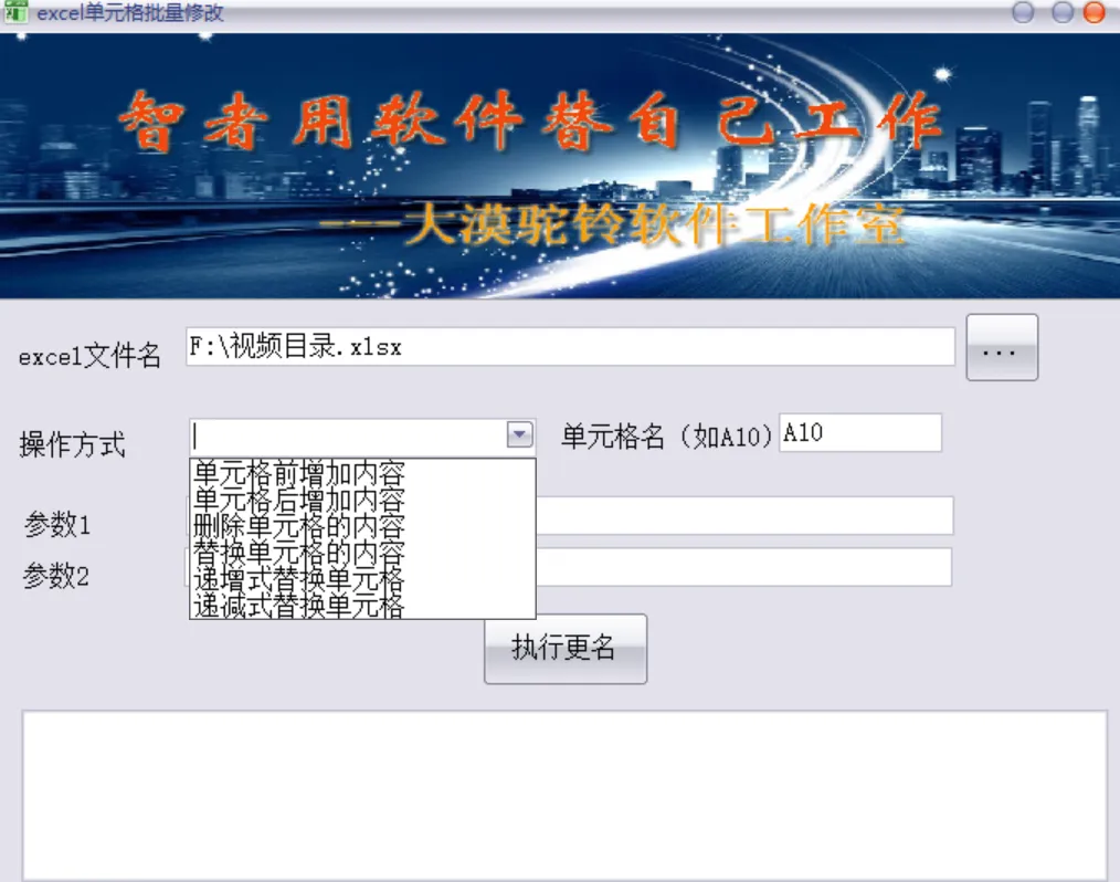 1、excel单元格内容批量修改工具是大漠驼铃软件工作室自主开发的一个小工具,用于批量修改excel文件指定单元格的内容。2、提供了批量在单元格前增加内容,批量在单元格后增加内容,批量删除单元格内容,批量替换单元格内容,递增替换单元格内容。3、特别是递增替换单元格内容,可以方便将工作表中从第一张开始的单元格的内容替换成如8月1日,8月2日。软件亮点工具支持多种筛选条件,精确选中需要批量修改的单元格。支持多种版本的Excel文件,确保工具的广泛适用性。软件功能1、excel单元格批量修改工具具备了简单直观的操作界面,可以通过简单几步修改Excel单元格。2、提供六种不同的修改方式,可以适用于各类常见的Excel单元格修改场景。3、在选择修改方式后,自动弹出详细的使用说明,对于新手用户十分友好。4、支持修改xls、xlsx两种格式的Excel文件。5、当您需要处理Excel电子表格时,此软件可以为您提供一定的帮助。推荐理由工具功能强大,能够满足大部分用户在Excel单元格批量修改方面的需求。经过长时间的使用测试,工具运行稳定,无重大故障发生。回复: 40767即可获取