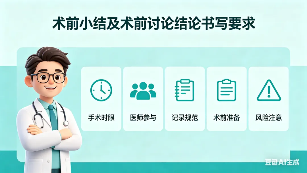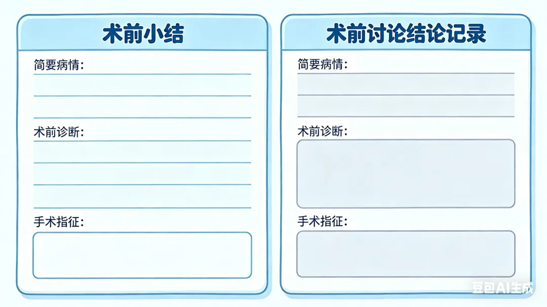 术前讨论是十八项医疗质量安全核心制度之一,不仅是保障手术安全、降低医疗风险的关键环节,更是规范诊疗行为、提升医疗质量的重要举措。很多医生容易混淆归档科室台账的"术前讨论记录"和放入病历的"术前讨论结论记录",或因内容不完整、重点不突出导致文书不合格。