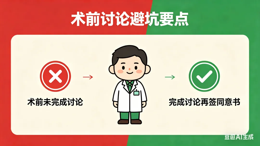 ❌ 错误:择期手术术前未在24小时内完成讨论,急诊手术未及时补充记录;术前讨论未完成即签署手术知情同意书、开具手术医嘱