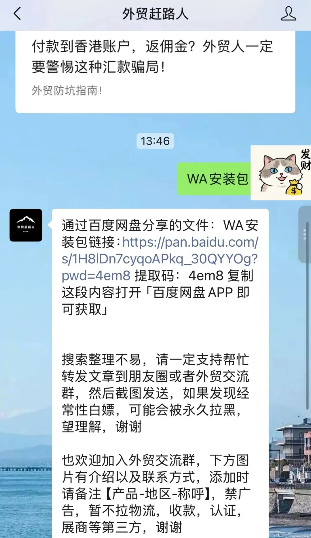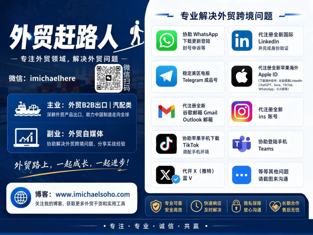 WhatsApp最新安装包!解决外贸跨境出海问题⇧点击上方蓝字,关注“外贸赶路人”WhatsApp安卓安装包现以网盘的形式免费分享给大家。请点赞,在看,转发支持前排重点推荐阅读l获取方式视图安装包获取方式:文章右下方点击【点赞、在看】转发此文章到【朋友圈】 或【 外贸群】截图后,关注公众号发送截图认证,并回复关键词:wa安装包关键词没有空格失效的话,也麻烦小伙伴们及时反馈~更新时间:每间隔1-2周,定期更新会持续更新,建议长期关注并星标公众号提醒:安装的时候,可以尝试不删除旧版WhatsApp,直接覆盖进行安装,这样大概率不用再次验证手机号短信,避免删除聊天记录。协助登陆WhatsApp,收不到验证码问题,非官方问题,安全限制无法登陆问题,解封代注册全新海外Apple ID代注册全新谷歌邮箱Gmail代注册全新Outlook邮箱外贸B2B归档资料|配合视频代注册全新国际领英LinkedIn|身份验证解决其他外贸问题|点击查看:END|推荐阅读:由于微信改了规则,不再按照时间顺序推送如果你经常收不到文章推送读完点一下“点赞”“在看”这样每次新文章的推送就会第一时间出现在你的订阅列表里啦:)感谢转发给更多外贸朋友们~