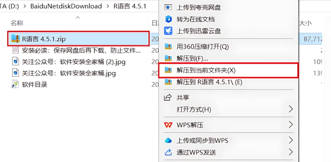 1、下载R语言 4.5.1软件安装包到电脑上,右键选择【解压到当前文件夹】。