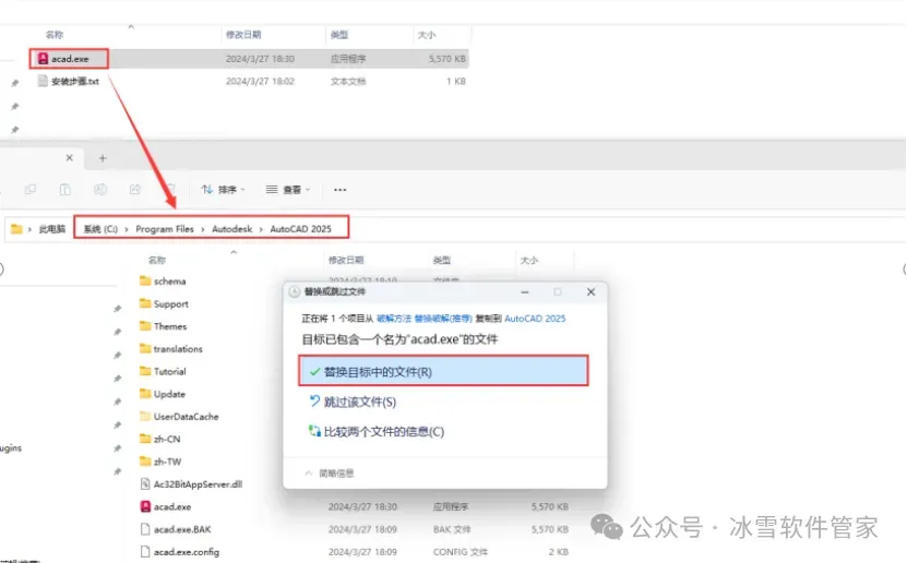 7.将"acad.exe"文件替换到CAD软件的安装目录中如果第三步没有修改安装路径,默认位置C:\Program Files\Autodesk\AutoCAD 2025