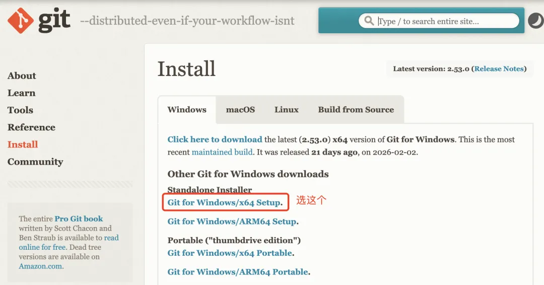 选择版本:点击 “Git for Windows/x64 Setup”(绝大多数电脑选 x64,ARM64 仅适用于高通骁龙处理器电脑);