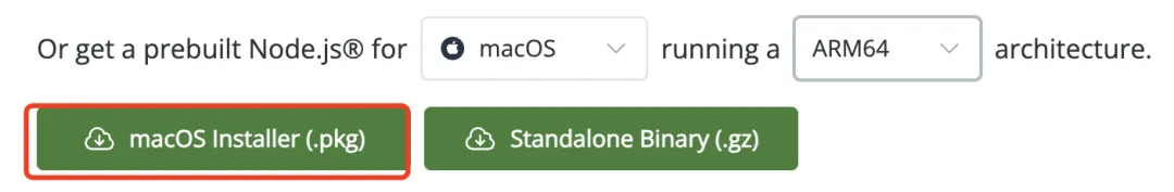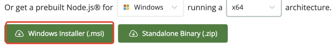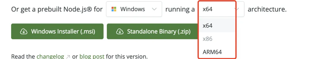 这个红色框里的选项,是让你根据自己电脑的 CPU 来选择对应的 Node.js 安装包。
