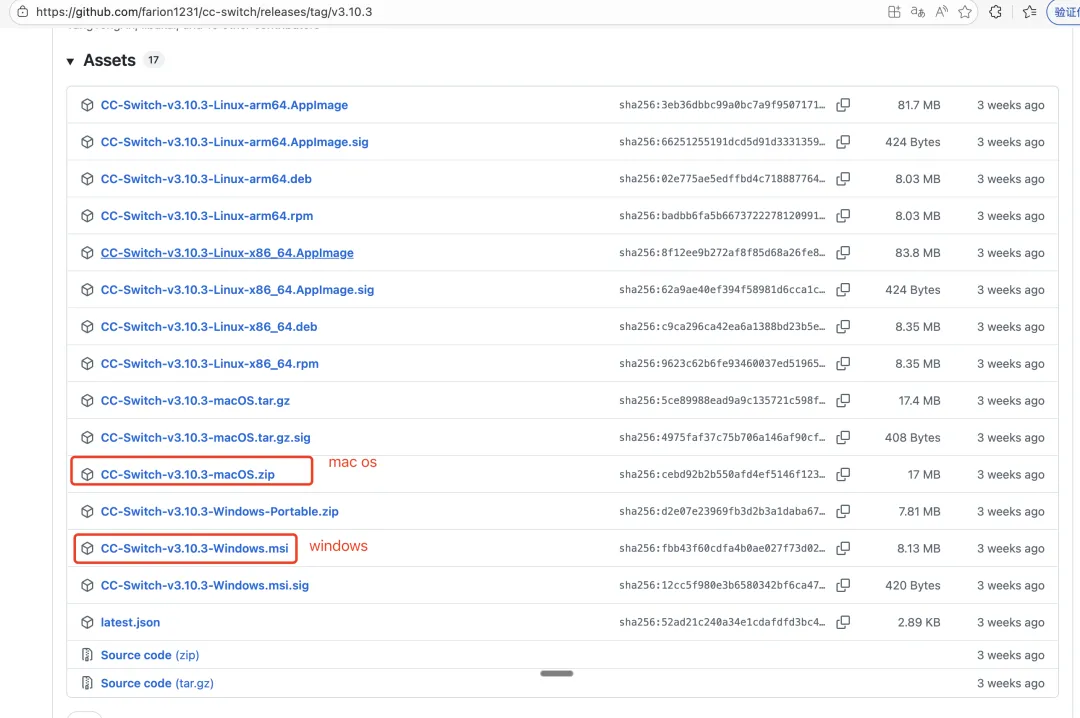 CC Switch 工具的下载地址:https://github.com/farion1231/cc-switch/releases/tag/v3.10.2