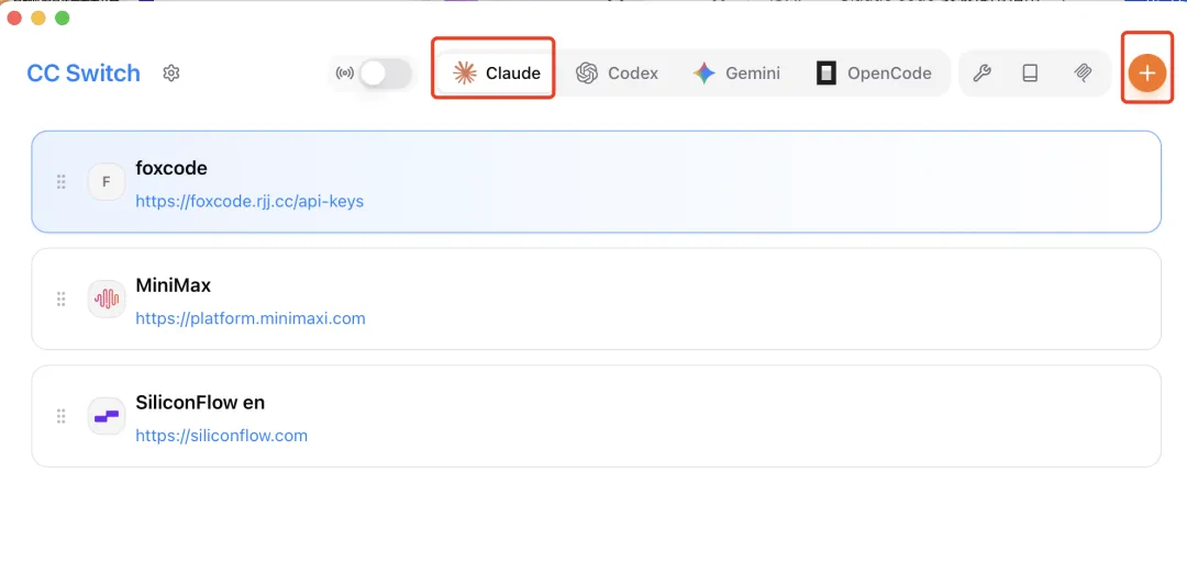 第一步,打开CC Switch,选择第一个标签Claude,点击右上角的“+”