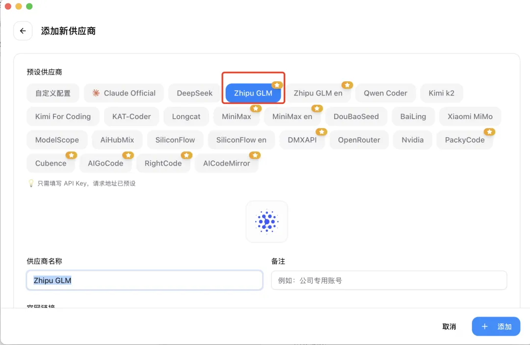 供应商可自行选择,有deepseek、智谱GlM、MiniMax等模型厂商自家平台,也有第三方中转的平台。