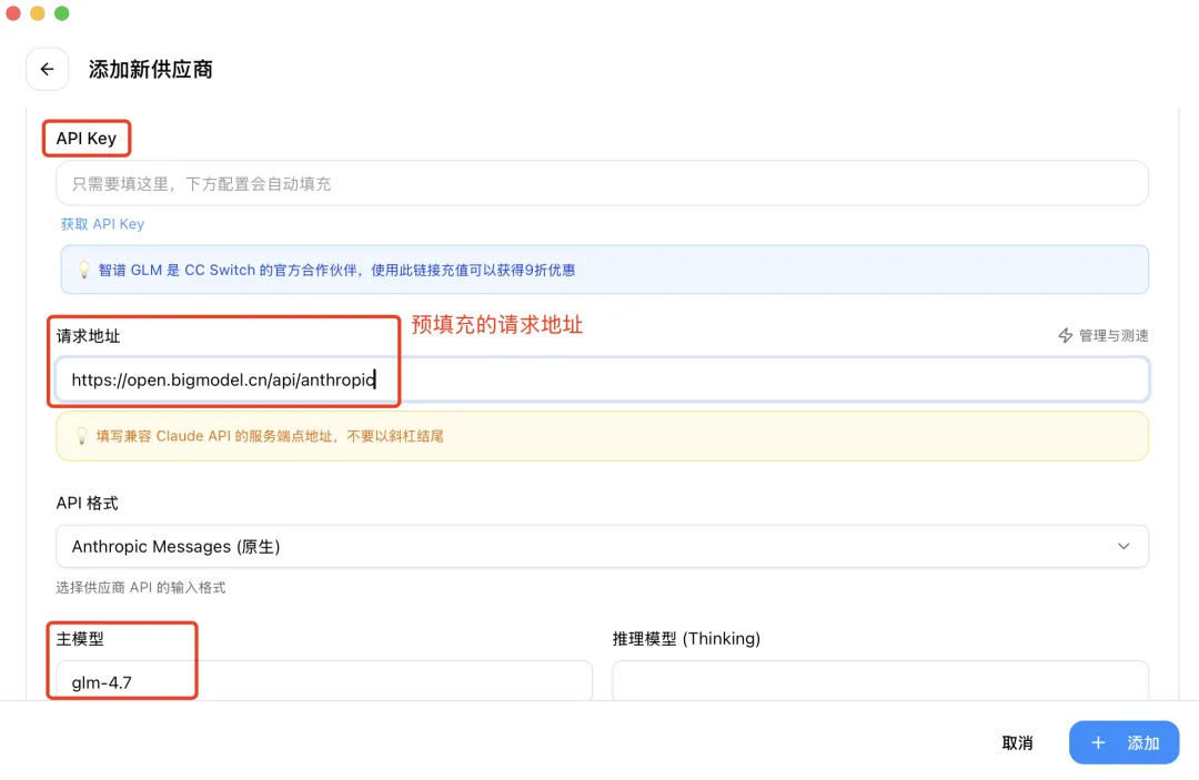 前面我们在模型供应商平台获得了API Key、请求地址,在这里我们把它配置到CC Switch中。