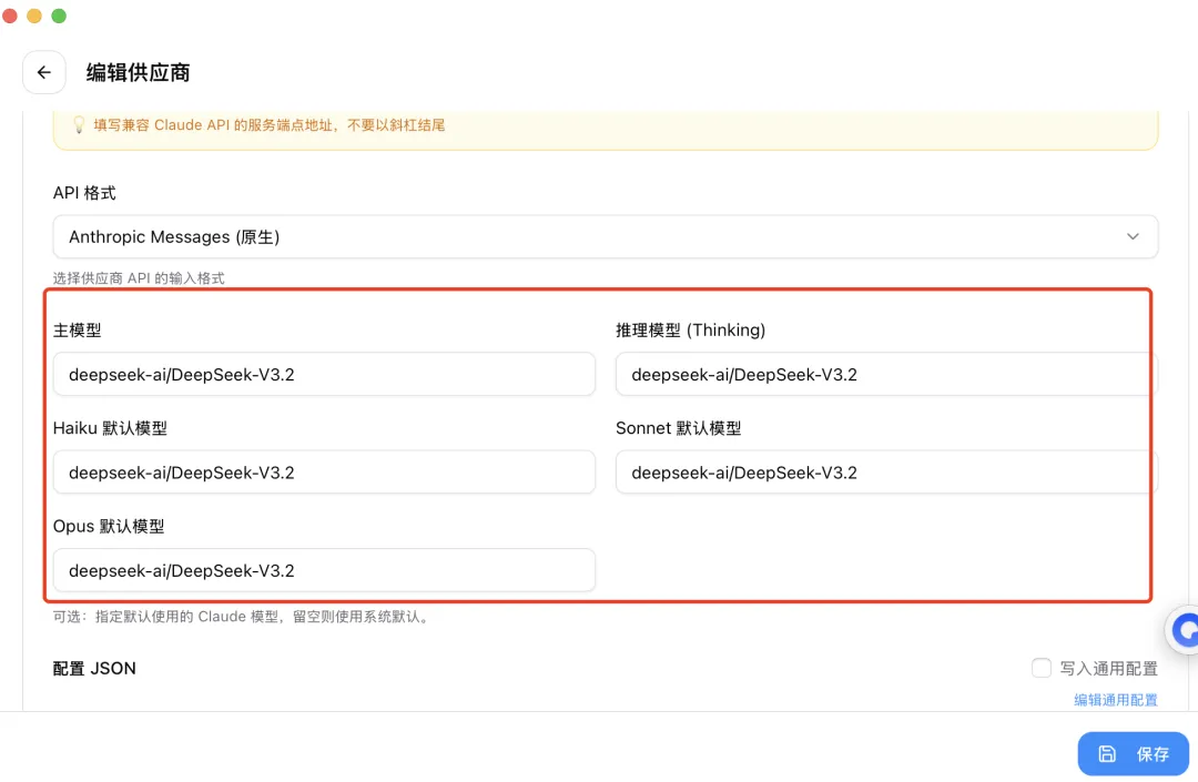 请求地址(必填):CC Switch会根据所选的供应商预填充请求地址,但有时候也不一定准确,如果不对,可以在模型供应商平台的API文档中找到,实在找不到可以问豆包。