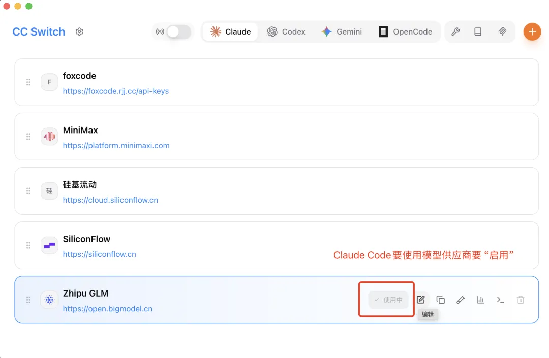 在CC Switch 中选择一个模型供应商“启用”,当然也可以对供应商进行切换,这样Claude Code就能接入不不同模型供应商。