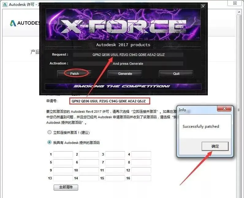 16.将“申请号”复制(ctrl+c)到"Request"框内(ctrl+v),点击“Patch”,在弹出的对话框点击确定。