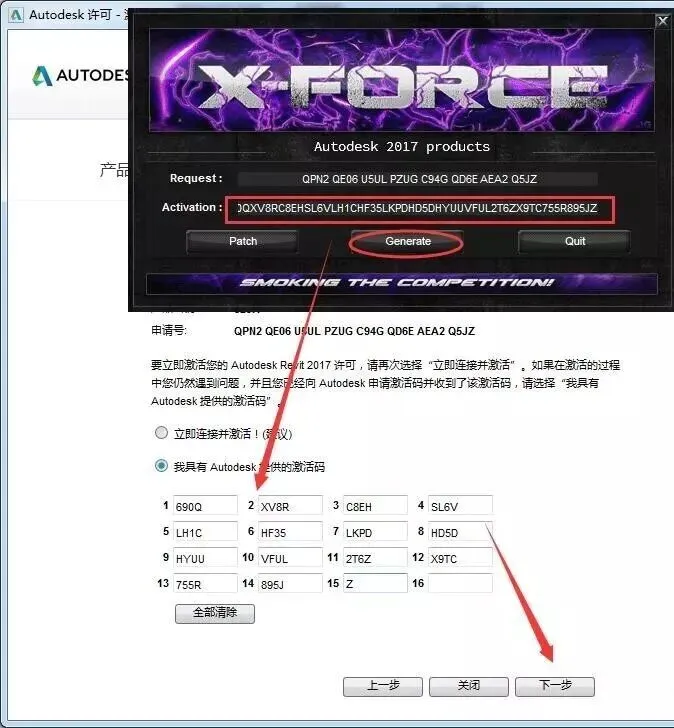 17.点击“Generate”生成激活码,将得到的激活码复制到图示框内,点击下一步。