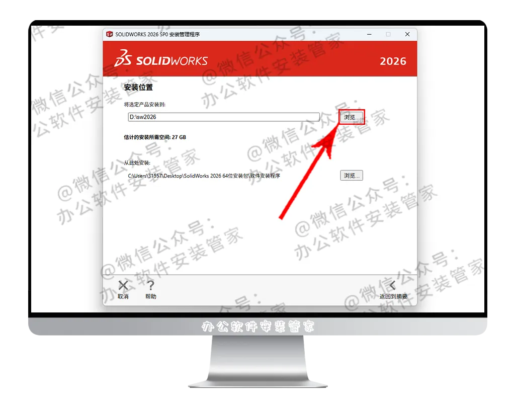 21.点击:【浏览】选择第4步在D盘新建的【sw 2026】文件夹